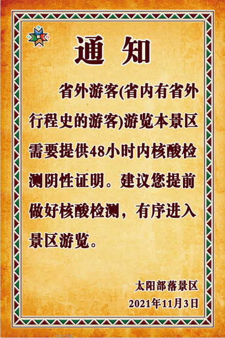 提醒!省外游客(省內(nèi)有省外行程史游客)游覽太陽部落景區(qū)須持48小時(shí)內(nèi)核酸陰性證明!